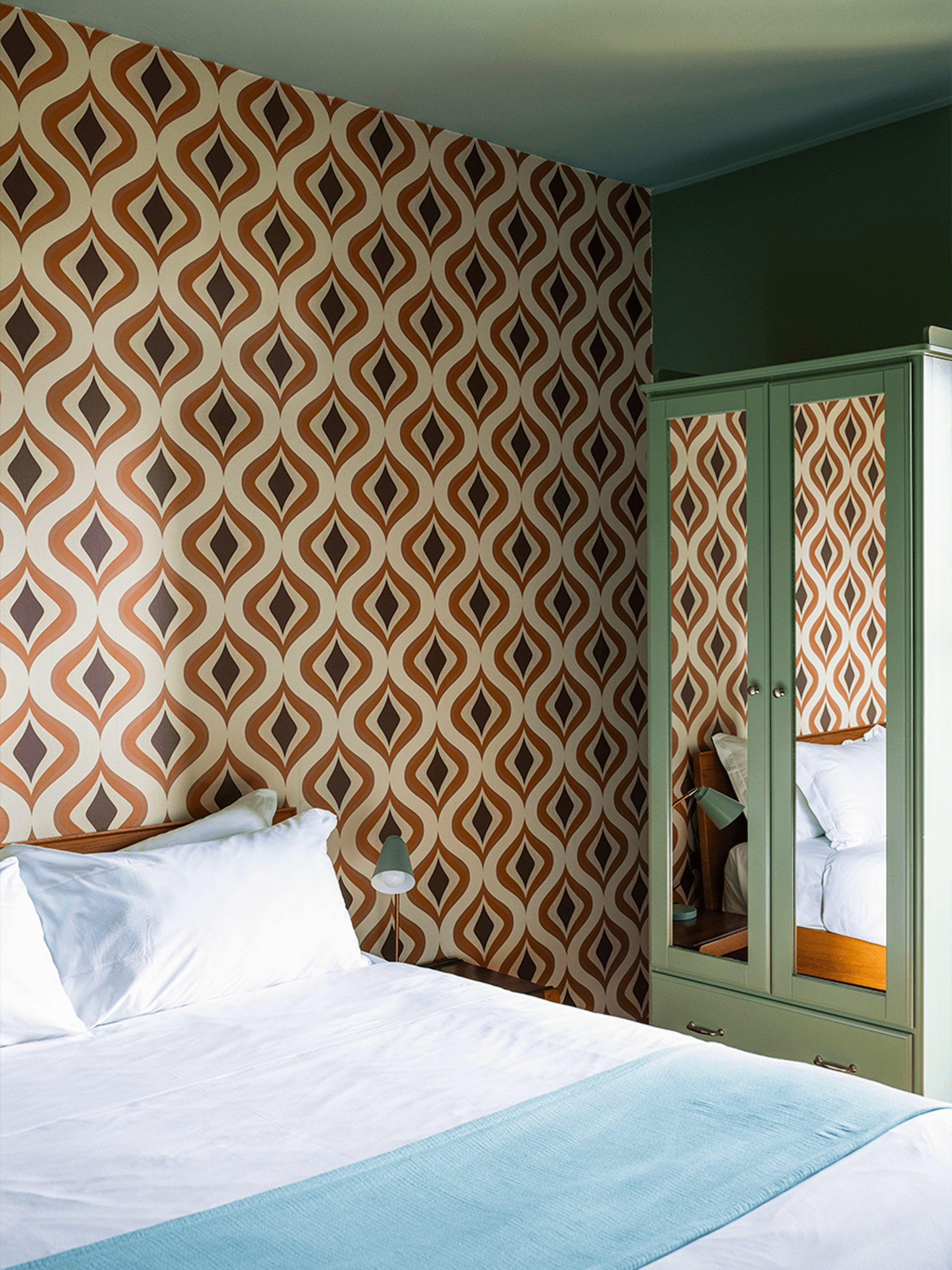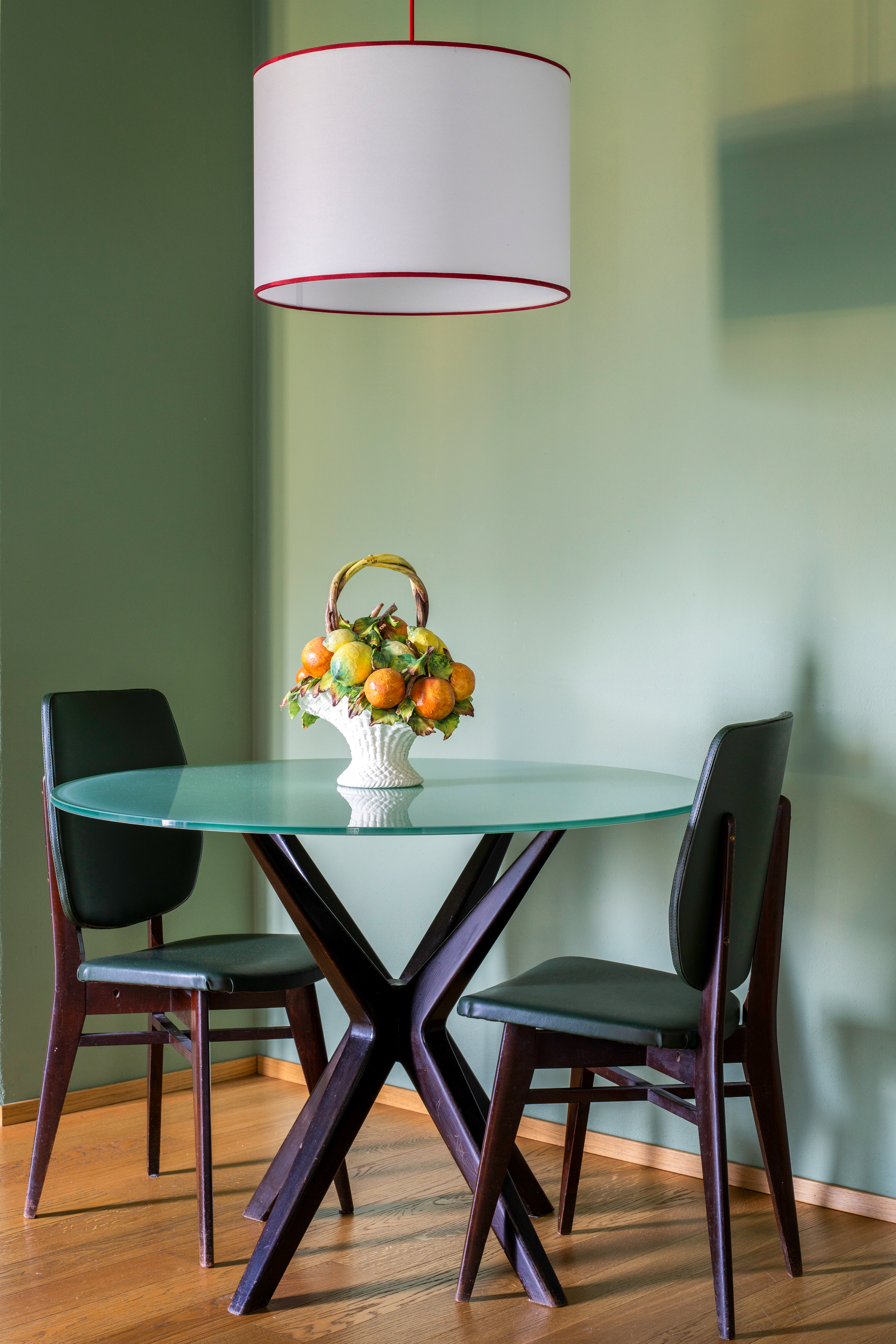 La Suite Arborella offre una vista sulle colline e sul lago. Il tavolo verde giada anni '60 ispira il colore delle pareti del soggiorno, in contrasto con la carta da parati geometrica viola melanzana e arancione. La zona giorno ha pavimenti in rovere, mentre cucina e bagno presentano piastrelle in Ceppo Lombardo. L'arredo include un tavolo rotondo con gambe in ebano intrecciato, sedie vintage verde inglese e una credenza in rovere anni '60. La cucina è moderna e attrezzata, il bagno spazioso con doccia walk-in, specchio in ottone e dettagli anni '60.