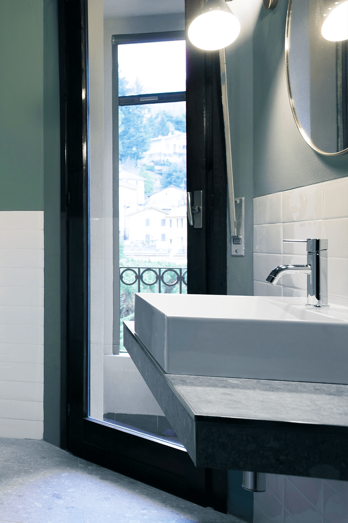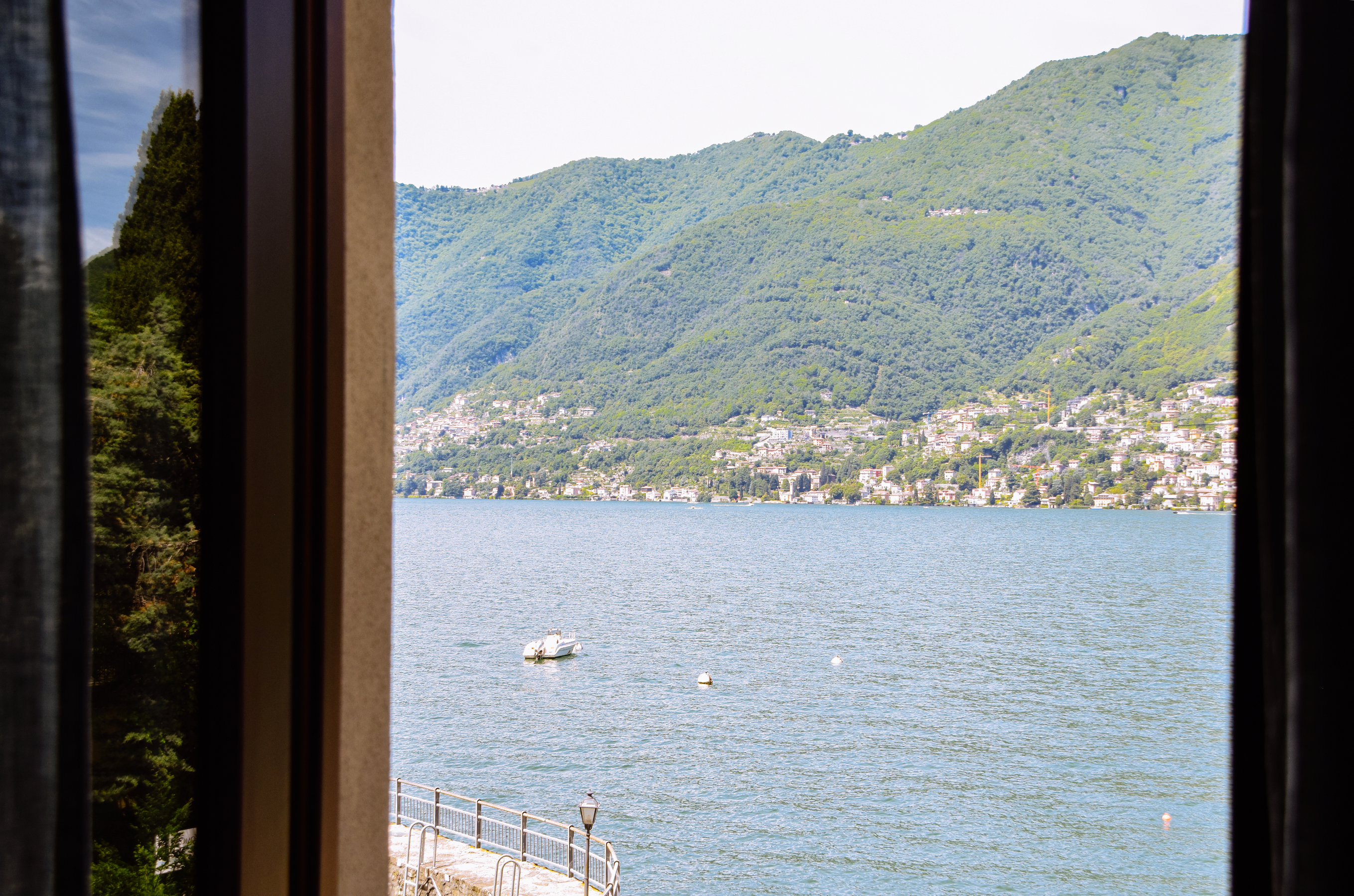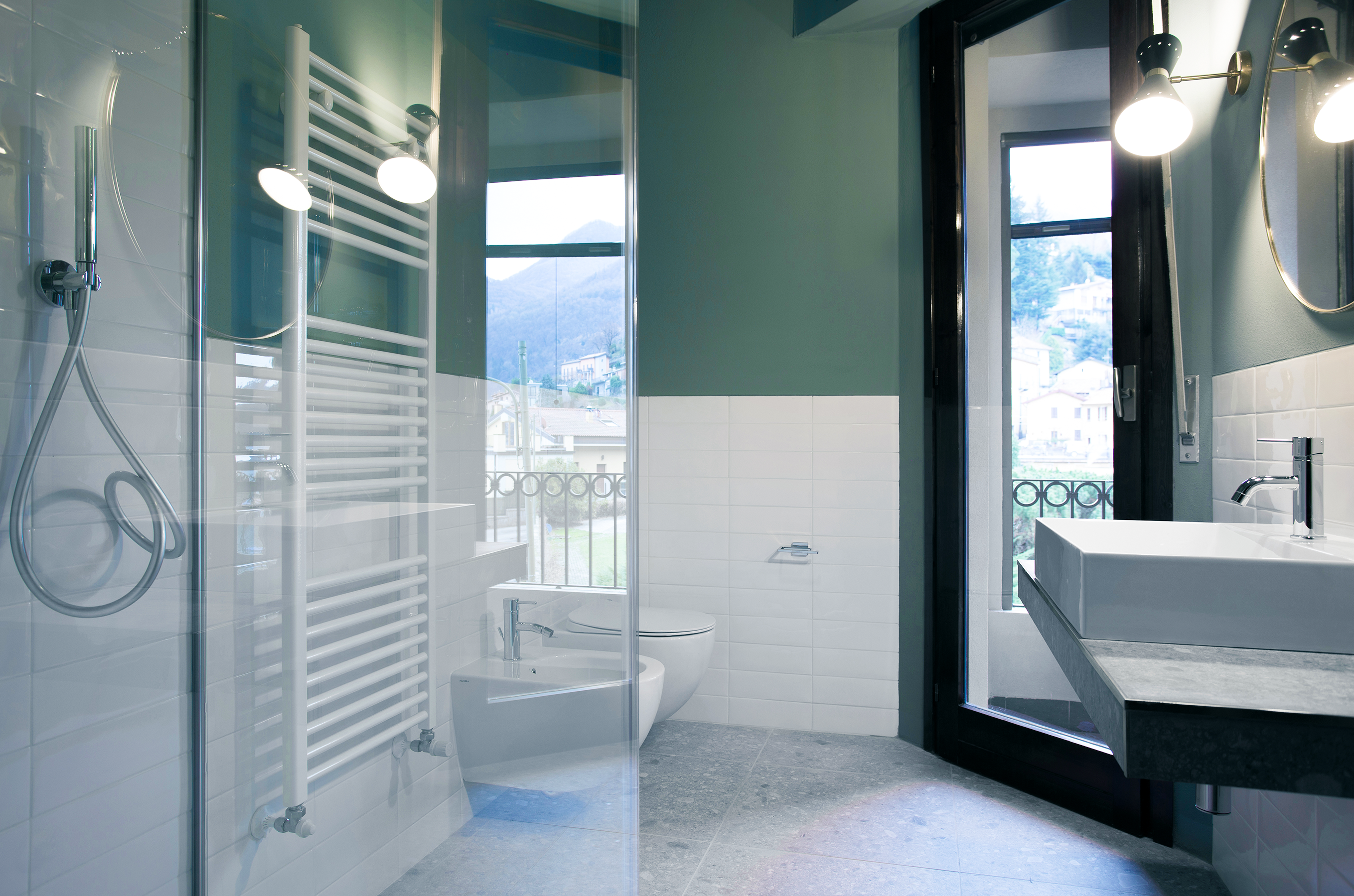 Il bagno è rifinito con ceramiche bianche, Ceppo Lombardo e dettagli in ottone, unendo funzionalità e stile. Dotata di aria condizionata, Wi-Fi, TV e comfort moderni, la Suite Luccio offre un soggiorno accogliente e di grande charme sul Lago di Como.