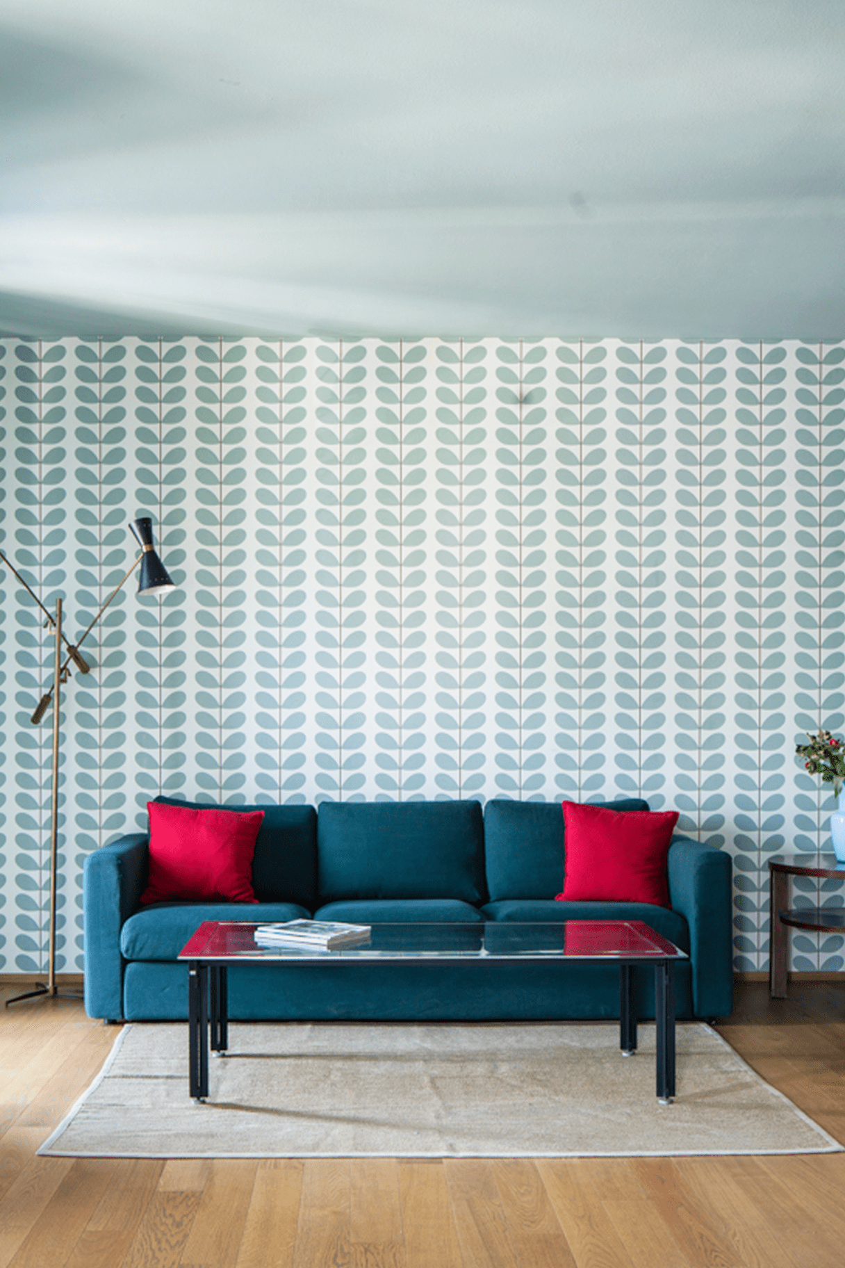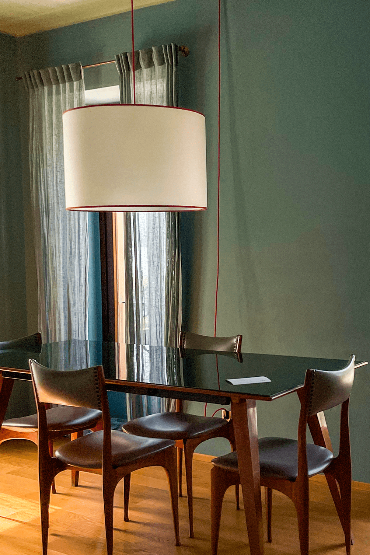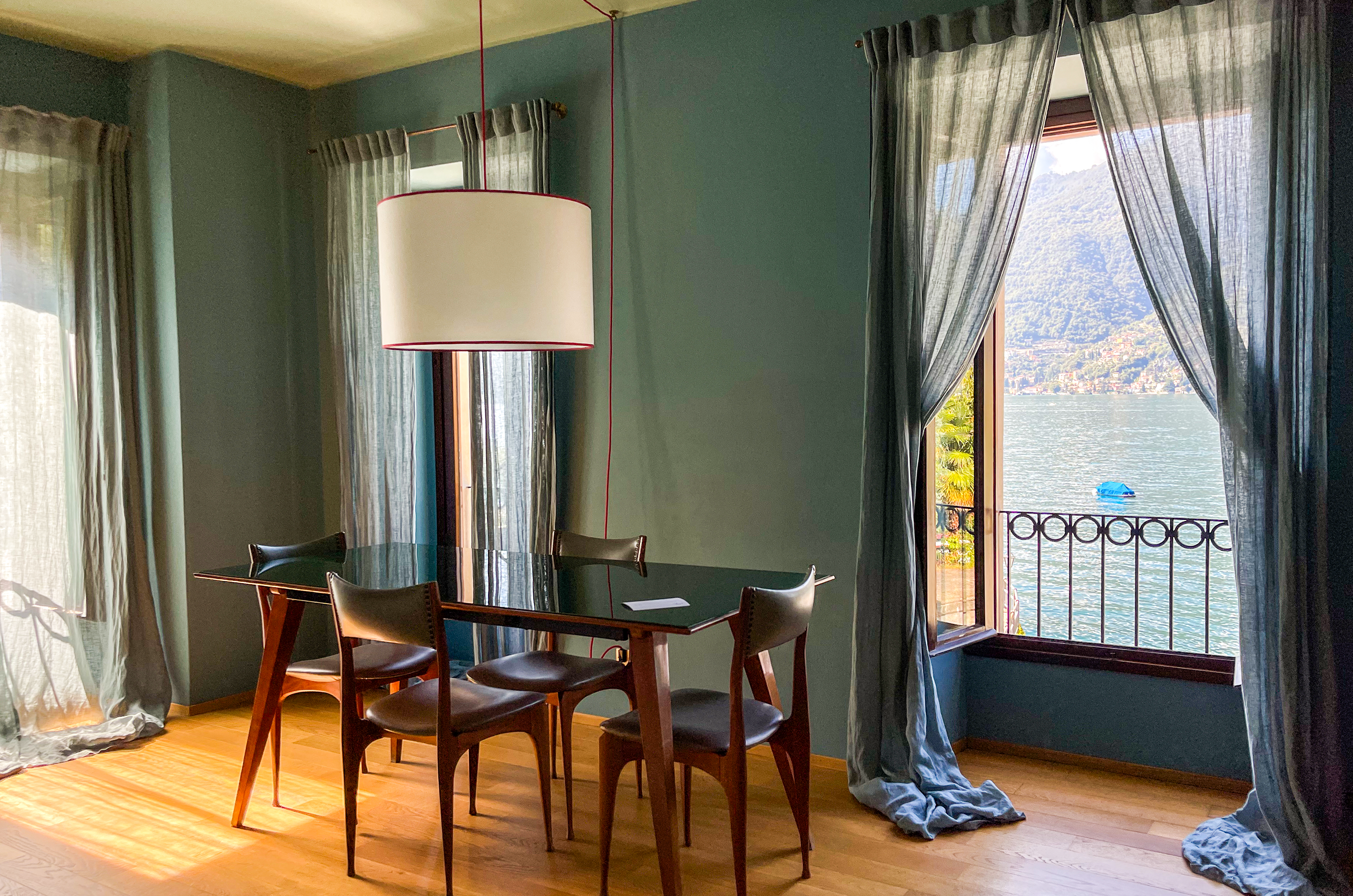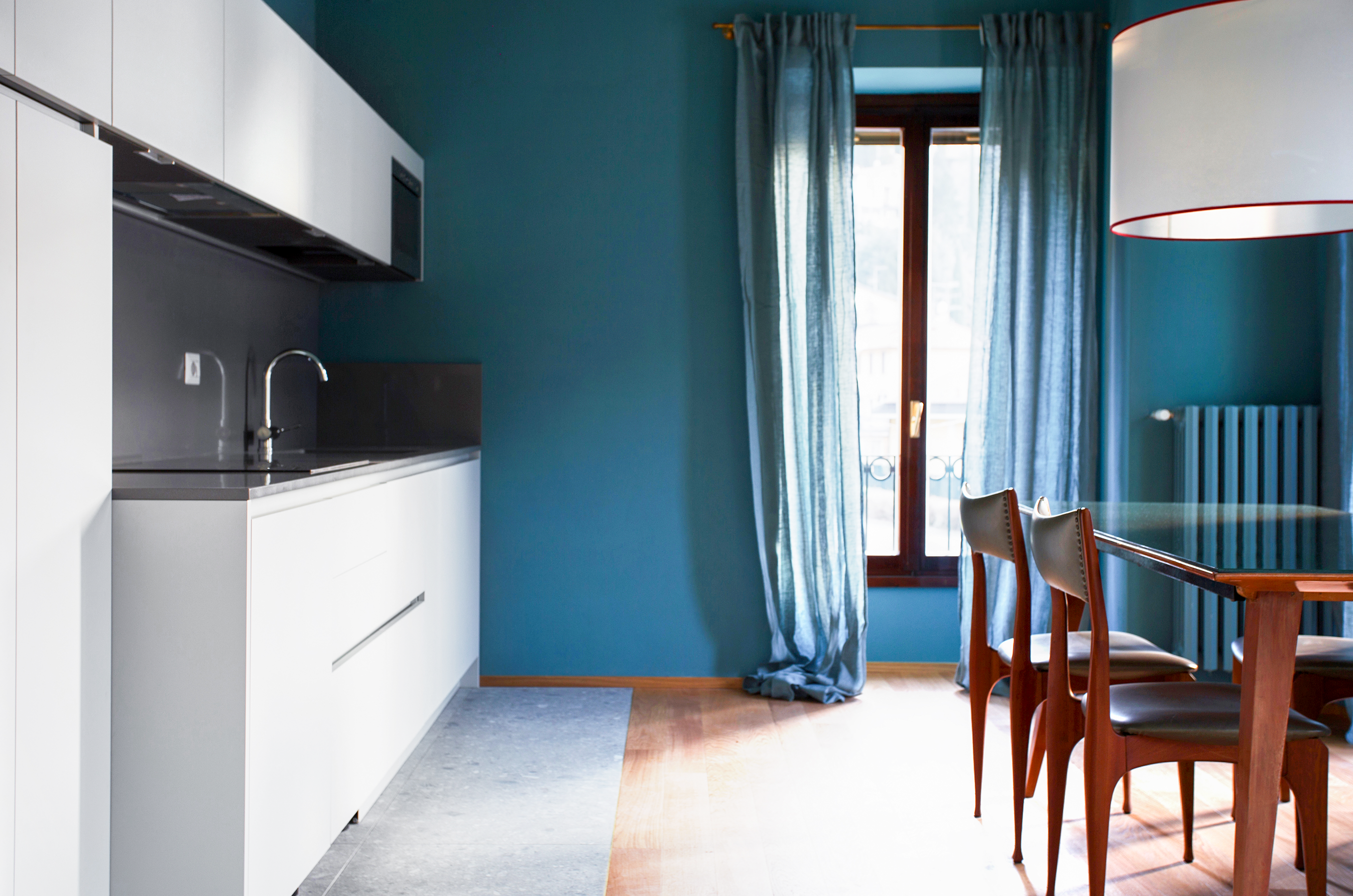 Gli arredi combinano pezzi vintage e icone del design italiano: sedie firmate da Ico Parisi, una grande lampada da terra disegnata da Giò Ponti e dettagli retrò che richiamano l’eleganza degli anni ’50 e ’60. Le carte da parati geometriche e le finiture in rovere completano lo spazio con armonia.